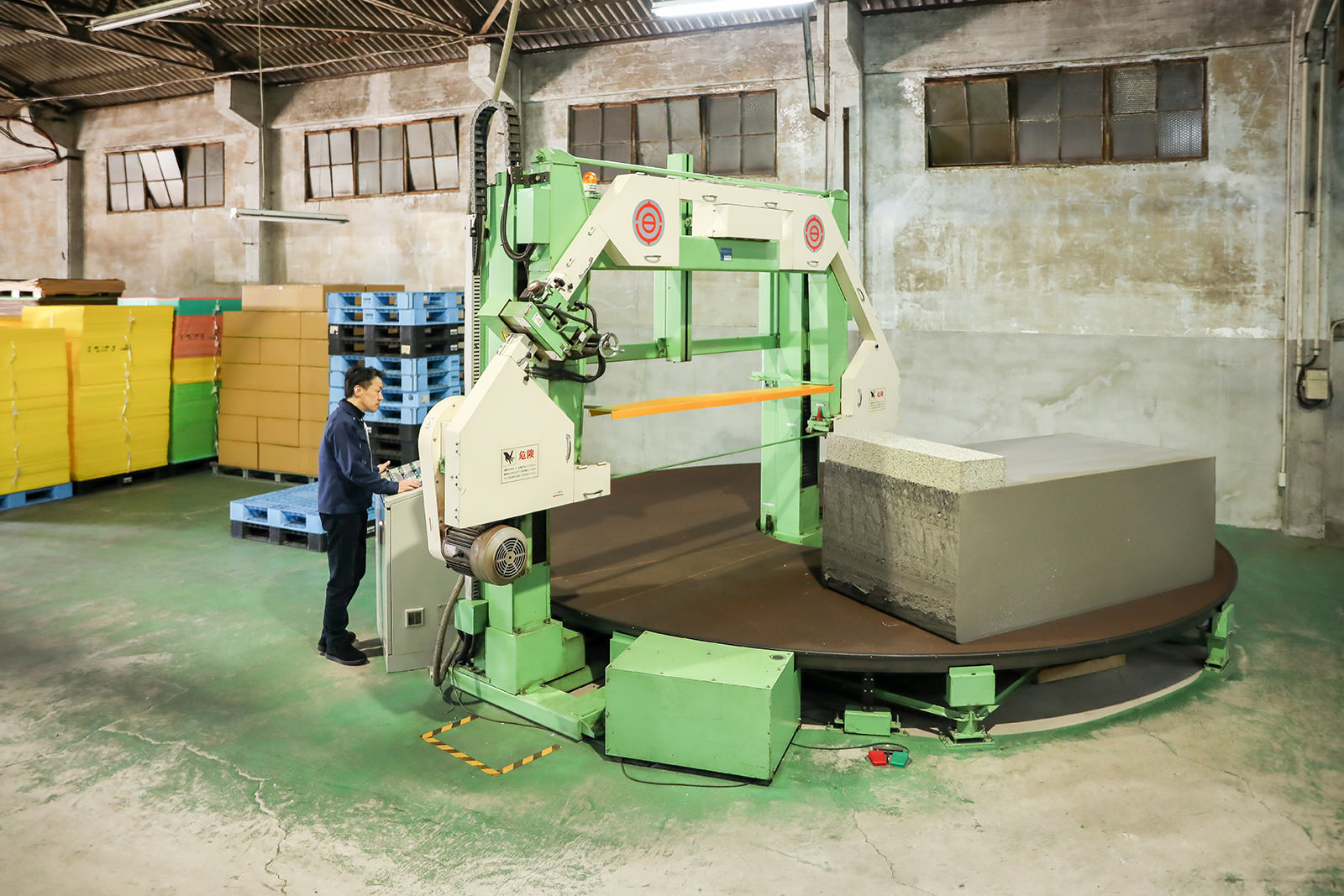ウレタンを垂直方向に裁断します。スキ加工でスライスした製品を様々な幅で加工し緩衝材などを製作します。